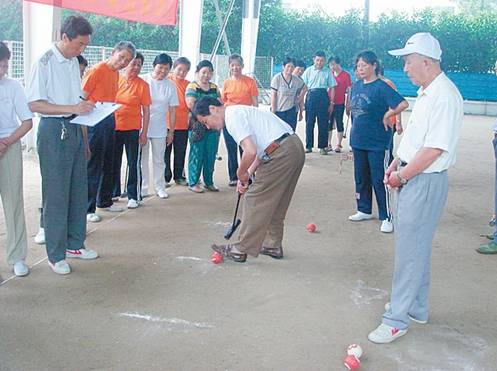 门球,这一舶来物已在我国生根、开花、结果,成为中国老人最时尚的一大体育项目。